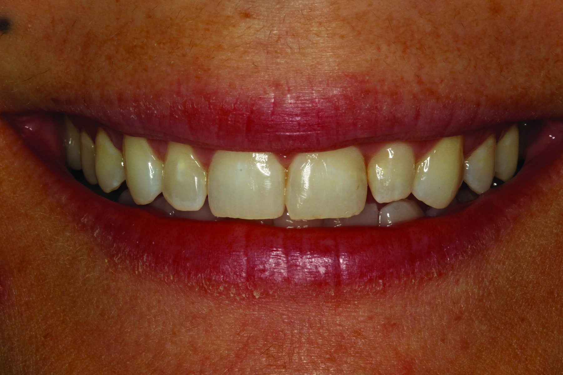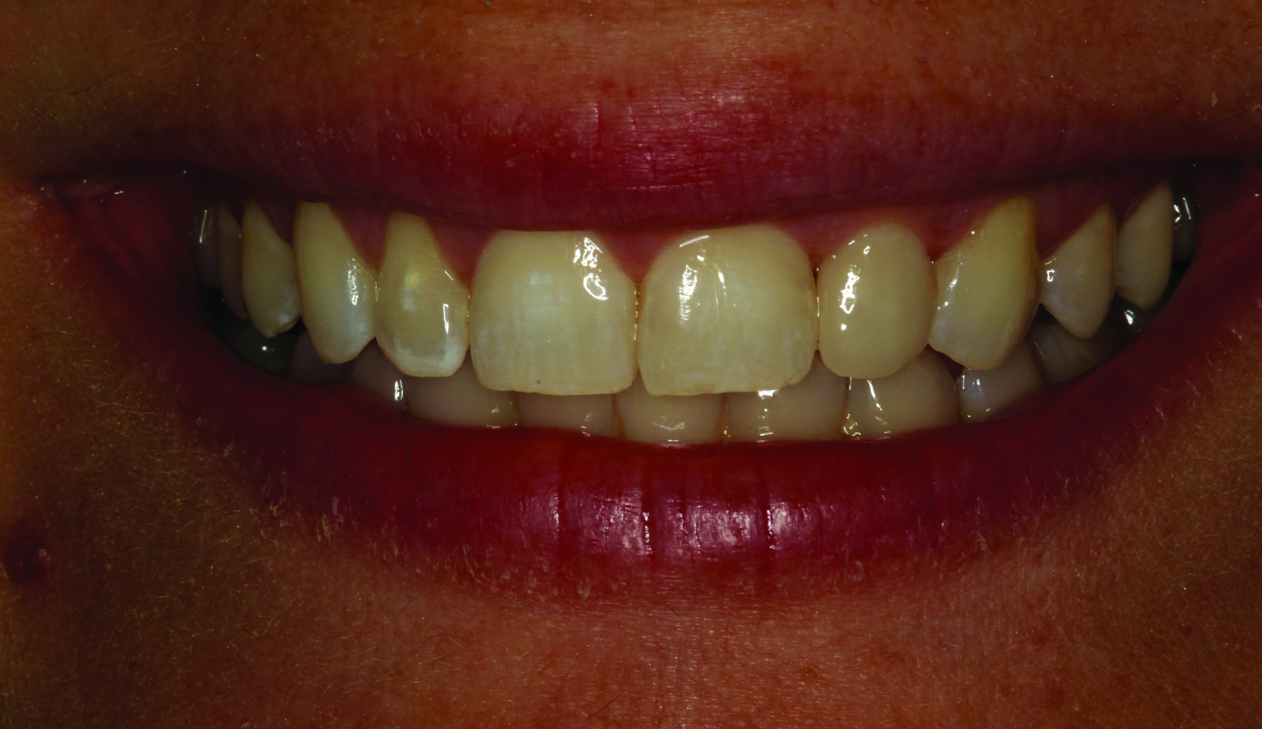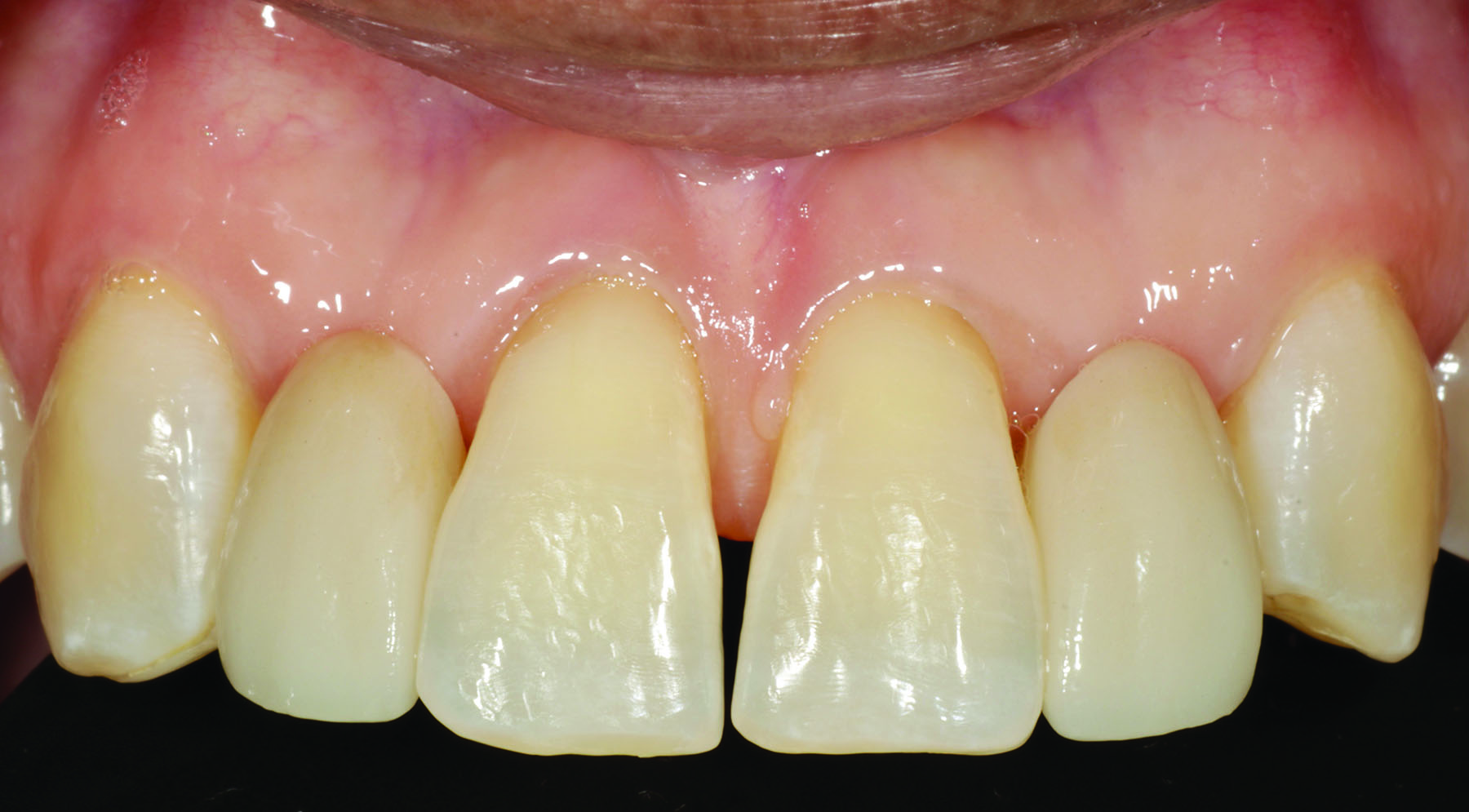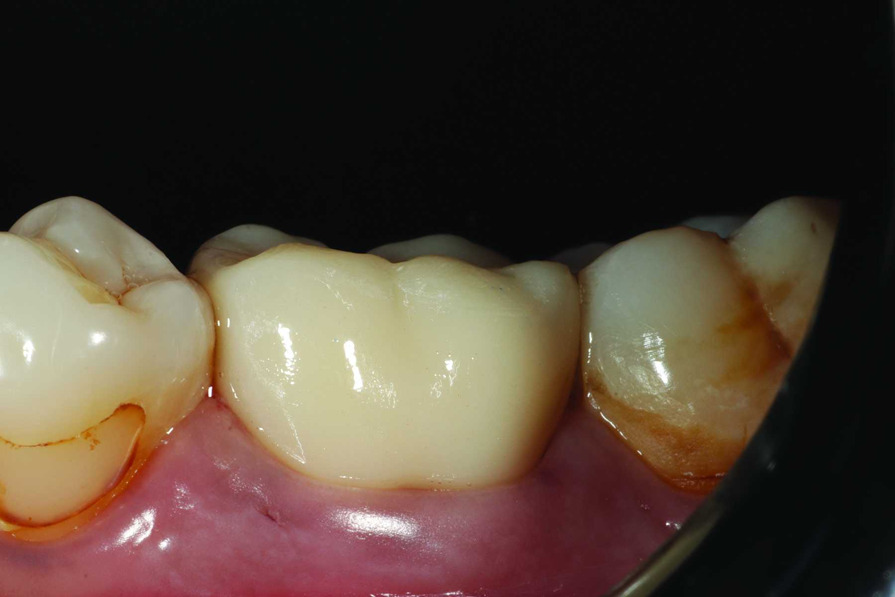 For indirect restorations, such as inlays, onlays, veneers, and crowns, with reduced wall height and/or excessive wall taper, the use of a dentin bonding agent and resin cement is ideal. Both older and newer glass ceramics have a well-documented track record of success with this approach, regardless of the preparation type selected. Ideally, any enamel involved is etched with phosphoric acid and a dentin bonding agent is used. For glass ceramics that are less than 1.0-mm thick, a light-cure only resin cement might be preferred to minimize the risk for color shift over time (Figure 1 through Figure 3). Meanwhile, ceramic restorations that are greater than 1.0-mm thick are better delivered with a dual-cure resin cement to ensure adequate polymerization of the cement. In either case, photopolymerization of the dentin bonding agent prior to placement of the restoration with resin cement produces much higher bond strengths. Practitioners using dentin bonding agents with low film thicknesses (ie, 5 to 25 microns) should be able to predictably perform this step at the time of delivery. Practitioners who choose to use dentin bonding agents with higher film thicknesses must either co-polymerize the dentin bonding agent with the resin cement, which can lead to lower bond strengths, or utilize a technique such as immediate dentin sealing.